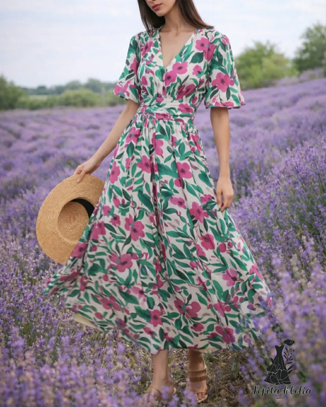 Robe longue coupe princesse imprimée fleuris