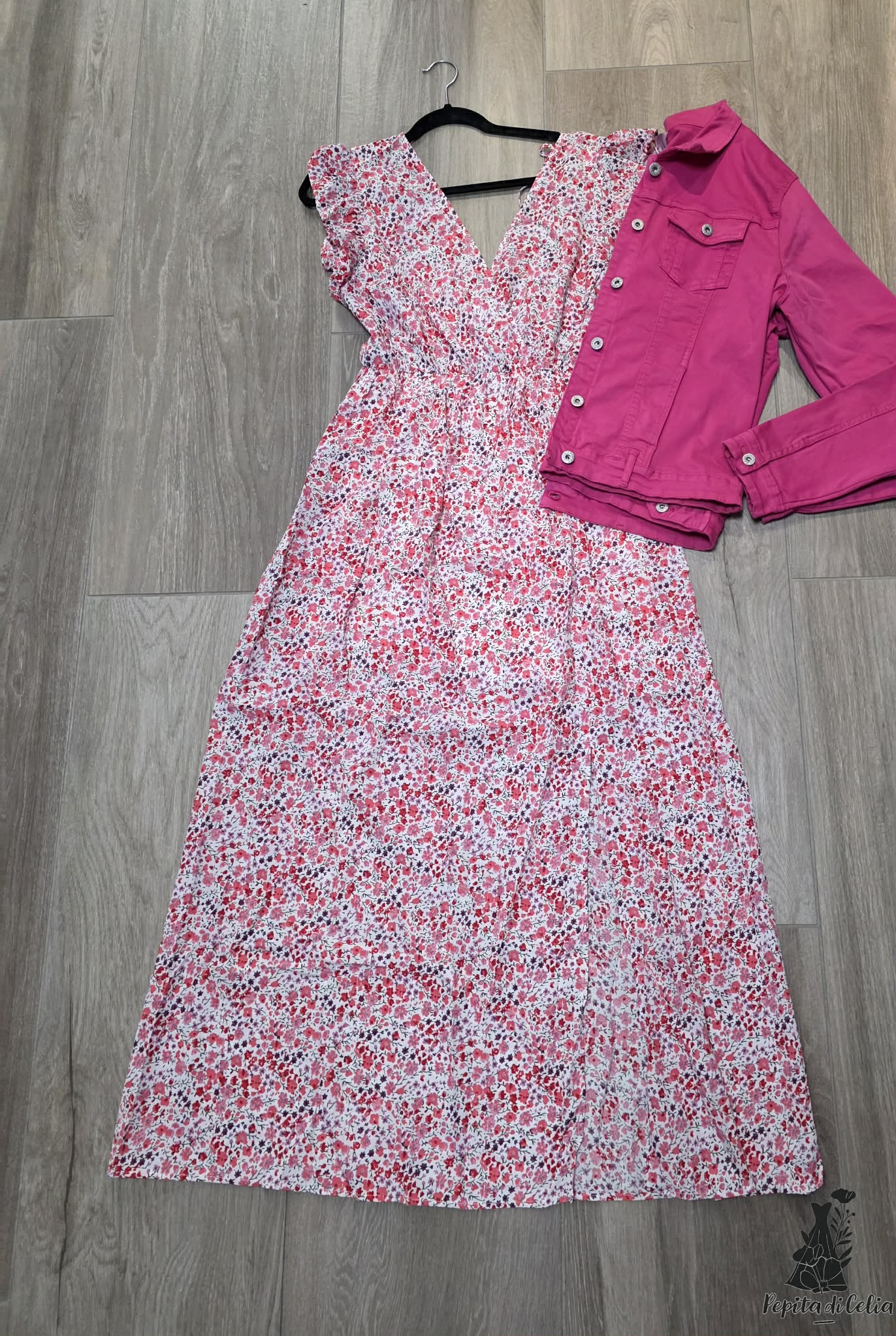 Une robe longue fluide à imprimé fleuri dans des tons rose/rouge, avec un joli décolleté en V. Elle donne un look léger et très printanier/estival. Nouée dans le dos.