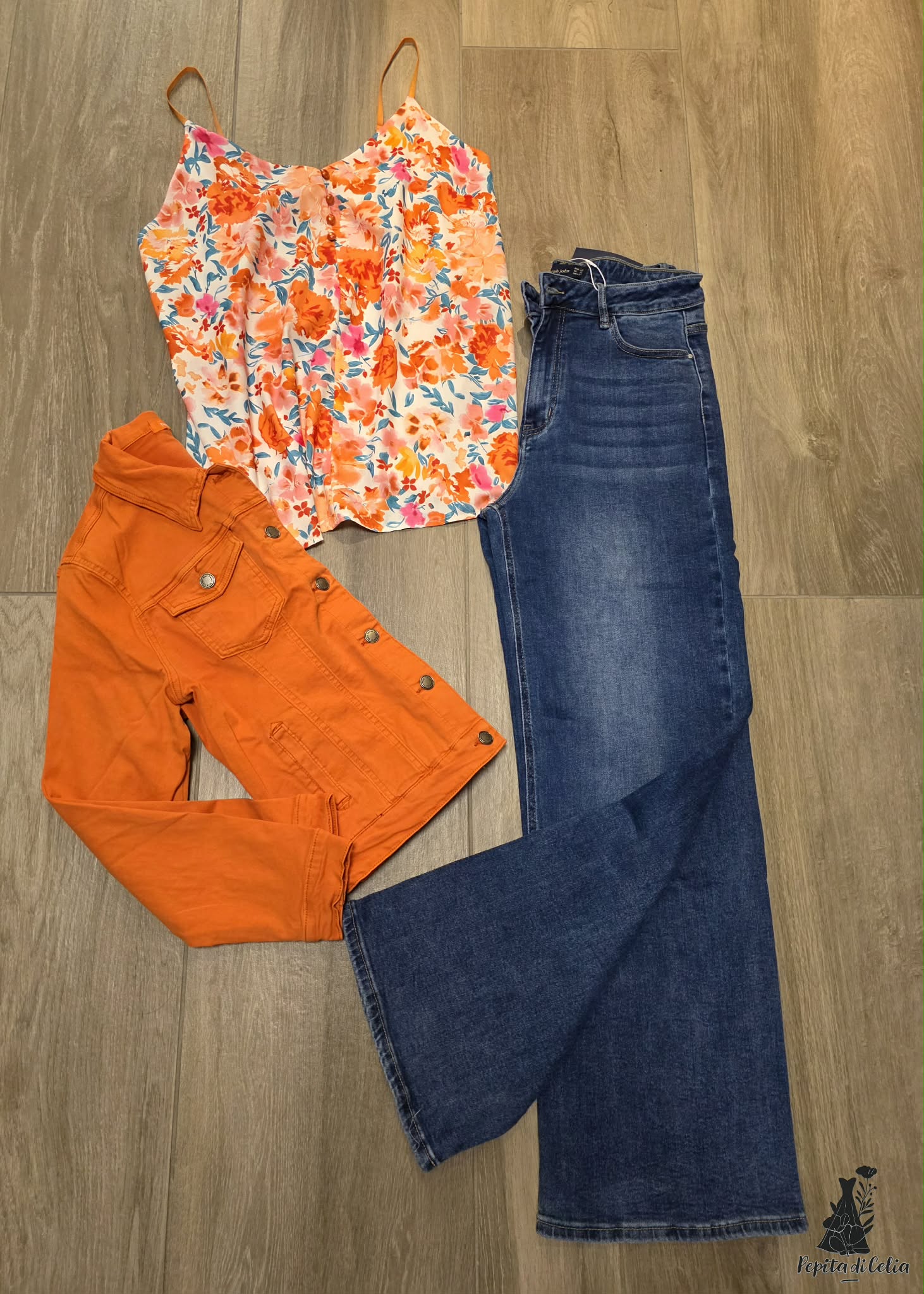 Le top imprimé avec 4 boutons, bretelles réglables. La taille 1 va correspondre d’une taille 36 à 40 et la taille 2 va correspondre d’une taille 42 à 48.